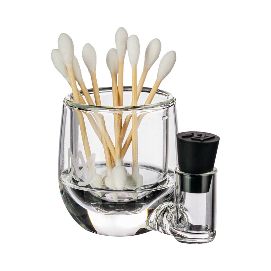 Crafted from premium borosilicate glass, the ISO Station features two integrated reservoirs: one for isopropyl alcohol and another for Q-tips or cleaning sticks. Its compact design makes it a perfect fit on any dab station or desk setup, while its durable construction ensures long-lasting reliability.