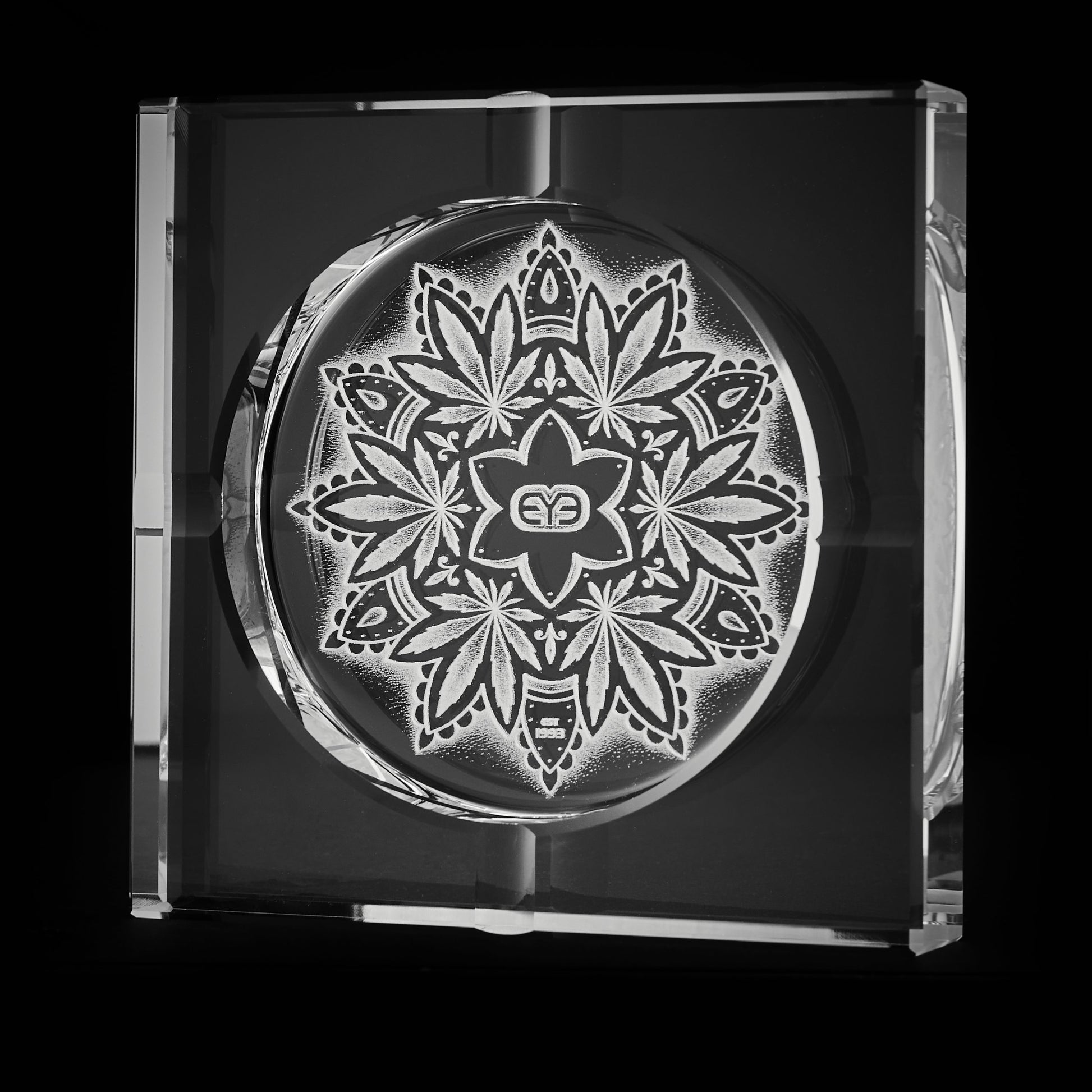 Crafted from premium borosilicate glass, this mandala hashtray combines aesthetic refinement with practical functionality. The intricate subsurface laser engraving creates a sophisticated optical effect that catches light beautifully, making it equally suited as a display piece or working accessory. At 130mm, it weighs 750g and offers substantial presence without compromising elegance. The precision engineering and quality materials reflect expert craftsmanship, delivering a piece that transcends its utilitarian purpose to become a genuine decorative statement.
