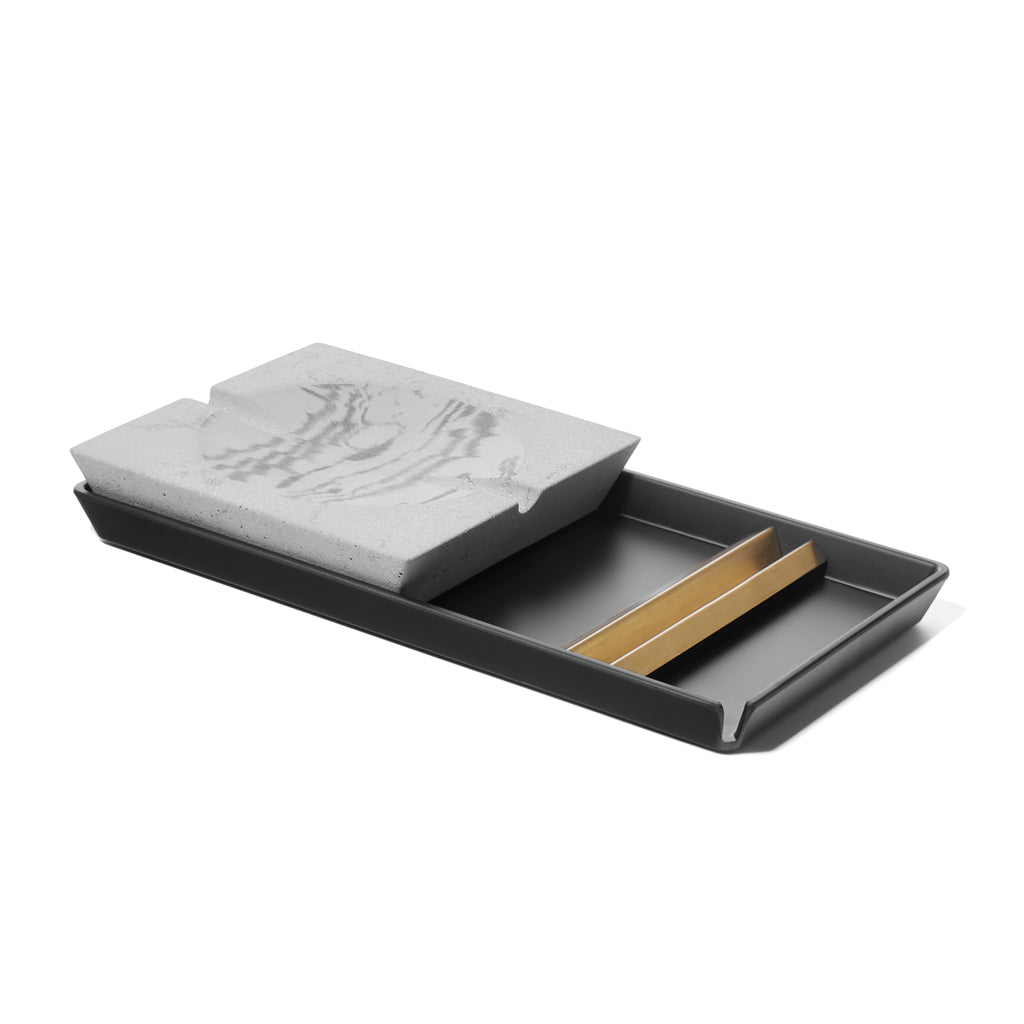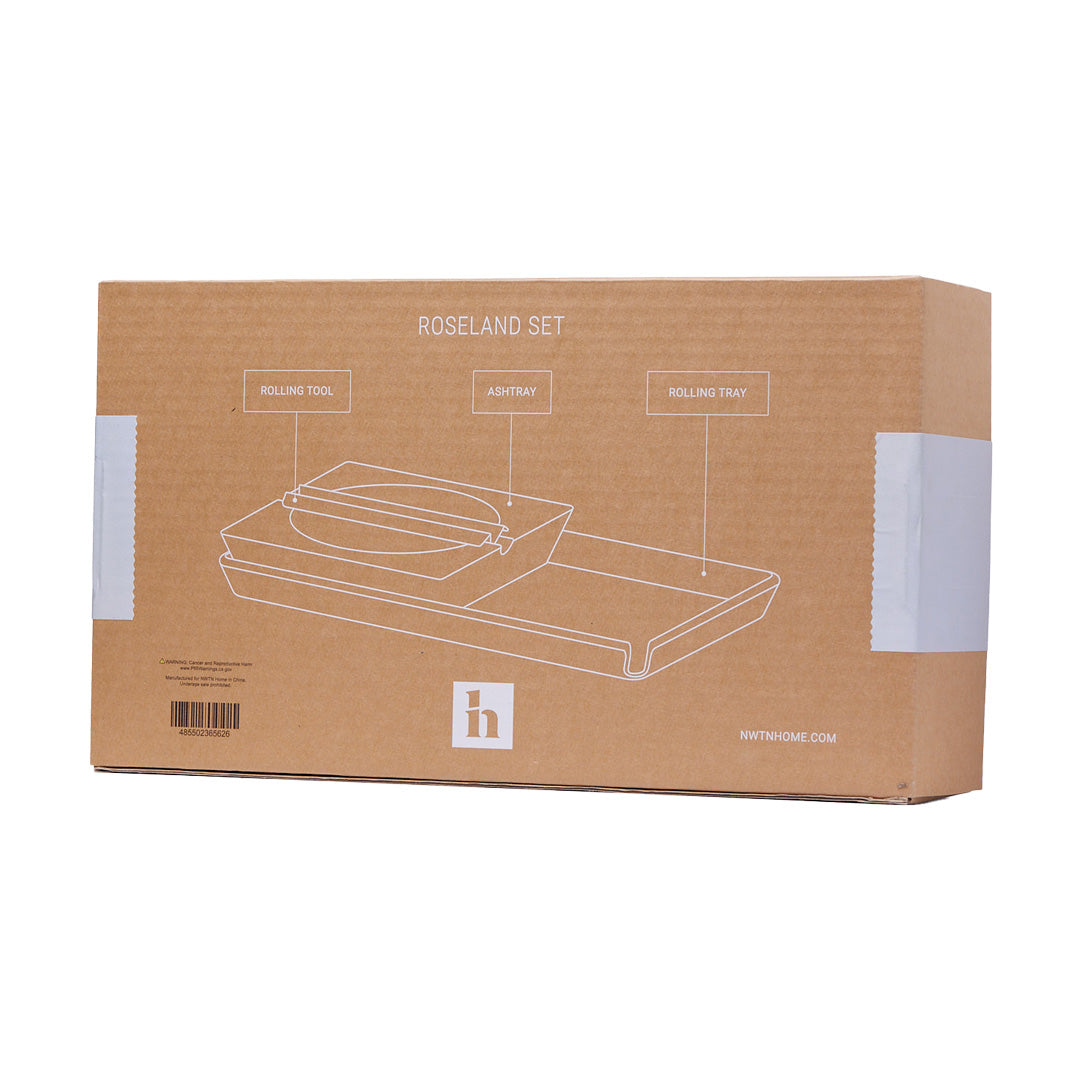 The Roseland Set is NWTN HOME's love letter to timeless style and effortless function. The hand-poured, marbled concrete ashtray rests atop a sleek melamine rolling tray and features a unique brass rolling tool perfect for separating your greens or holding your favorite papers in place.